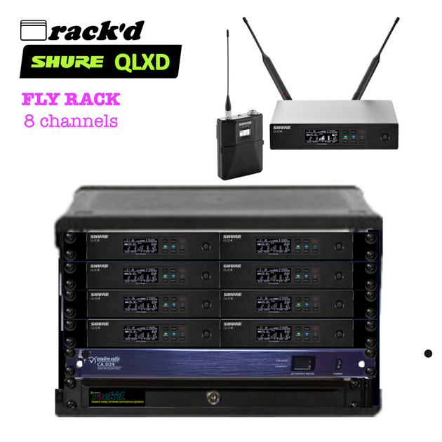 (C41) .8ch Rack'd Fly Shure QLXD 8 Channel Ready to Use Wireless System - just 2 antennas in an SKB Rack in a Case