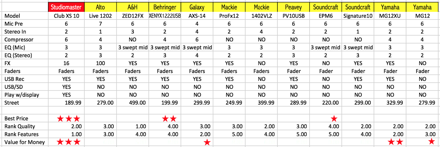 CLUB XS10 10 CHANNEL (6 MIC PREAMPS WITH COMPRESSORS) MIXER