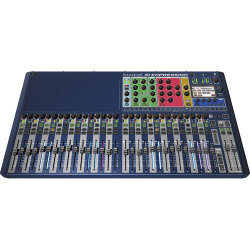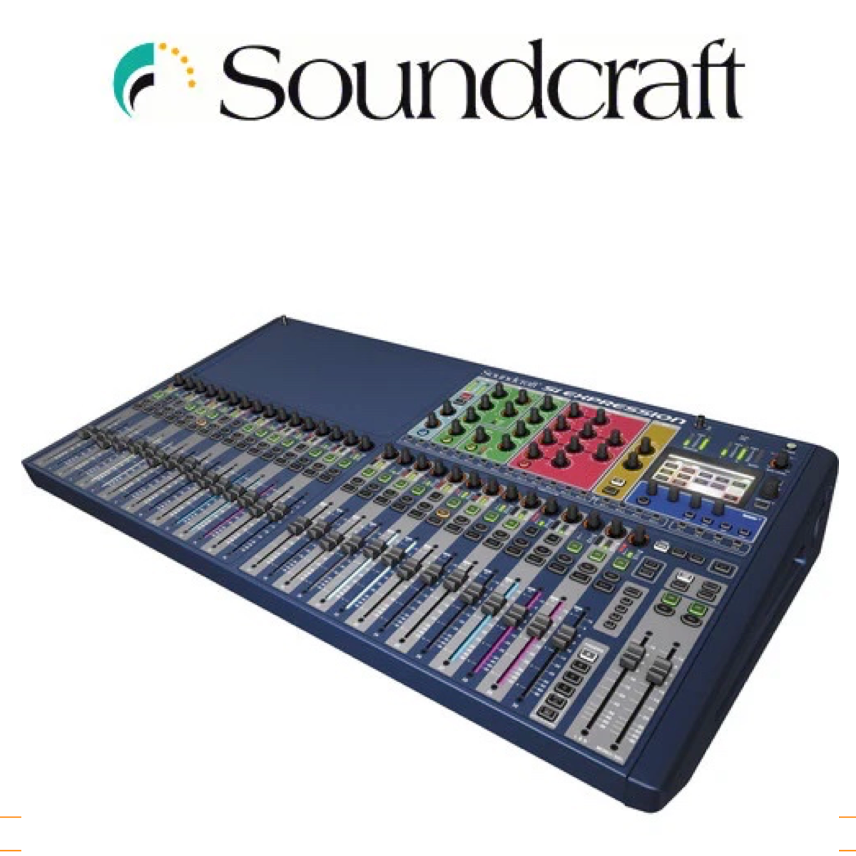 For I/O expansion, the mixer will accept any of the Soundcraft Si series option cards including AES, AVIOM, CobraNet, Firewire/USB/ADAT, Dante CAT5, and optical MADI. The MADI card allows you to connect to multi-track recording systems, plug-ins such as WAVES, and Studer or Soundcraft stageboxes. Using a stagebox increases both the number of physical inputs, as well as the number of input processing channels. Every processing parameter utilizes a dedicated control so that you do not need to navigate through menu hierarchies to make adjustments. A row of global mode encoders above each channel gives you control over gain, high-pass filter parameters, and pan position.