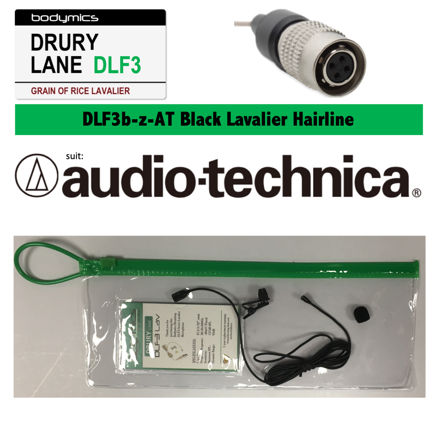 The Bodymics Drury Lane Series DLF3 lavaliers have an Omnidirectional pickup pattern and a flat frequency response from 20Hz to 20kHz and weigh about 1/2 ounce.