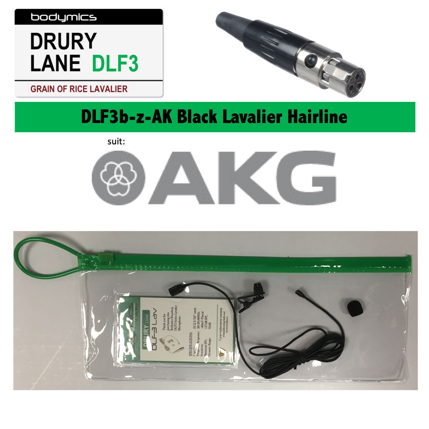 The Bodymics Drury Lane Series DLF3 lavaliers have an Omnidirectional pickup pattern and a flat frequency response from 20Hz to 20kHz and weigh about 1/2 ounce.