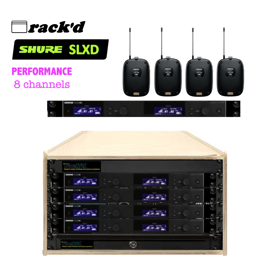 (C41) .8ch Rack'd Performance SLXD Shure 8 Channel Ready to Use Wireless System - just 2 antennas in an SKB Rack in a Case