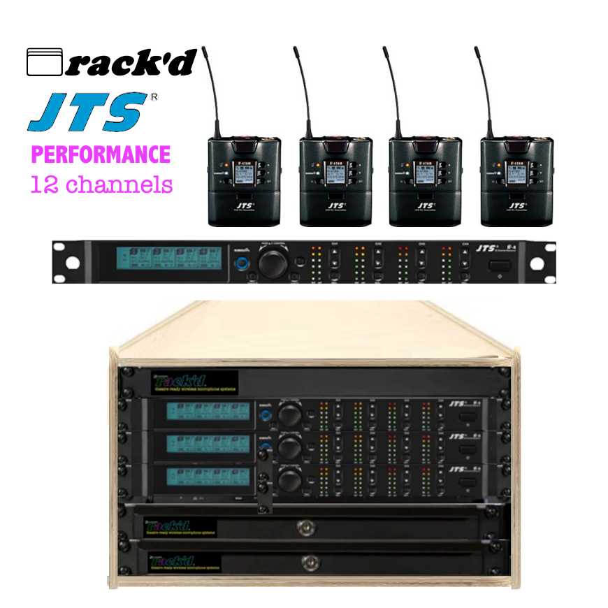 Our Rack'D PERFORMANCE RACK12 channel JTS R4 UHF system is built around 3x JTS R4 quad channel full width 1u rack receivers with built in antenna distribution so that everything can be run from just 2 antennas and 8x JTS R-4TBM (metal)  transmitter bodypacks  - built into an 6U Plywood Lacquered Rack or an SKB R4S ABS Rack Case with lids