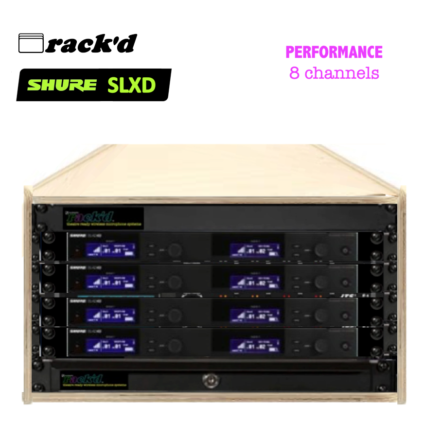 Our Rack'D Performance 8 channel SLXD system is built around 4xSLXD14D dual systems with receivers (1u rack) and transmitter bodypacks plus a high performance antenna distribution system so that everything can be run from just 2 antennas and built into a premium plywood lacquered 6u rack.