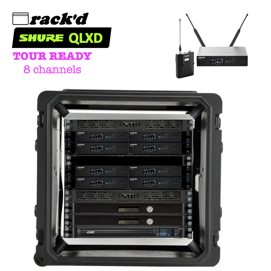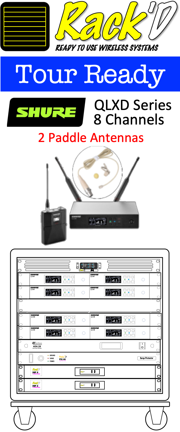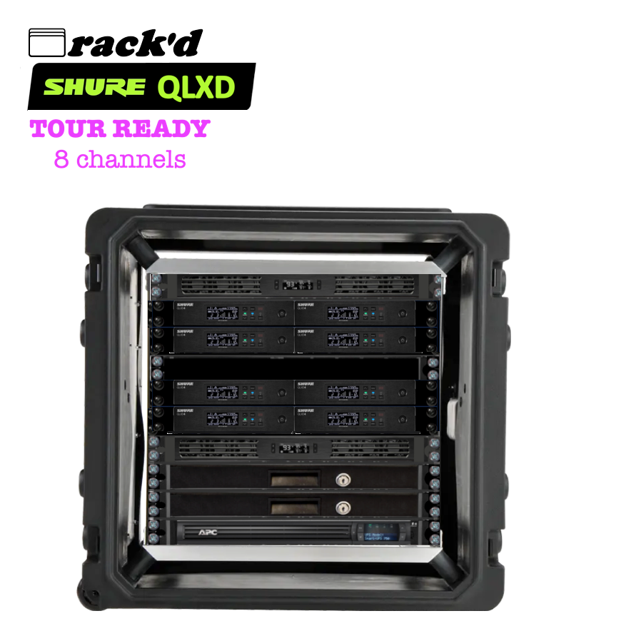 Our Rack'D TOUR READY 8 channel QLXD system is built around 8xQLXD14 digital over UHF systems with receivers (1/2 width 1u rack) and transmitter bodypacks plus a industry standard active antenna distribution system (CA.D29), Uninterruptible Power Supply and Forced Cooling System -all this built into a an SKB Shock Mount Rolling Case ) or ATA Shock Mount Rolling case