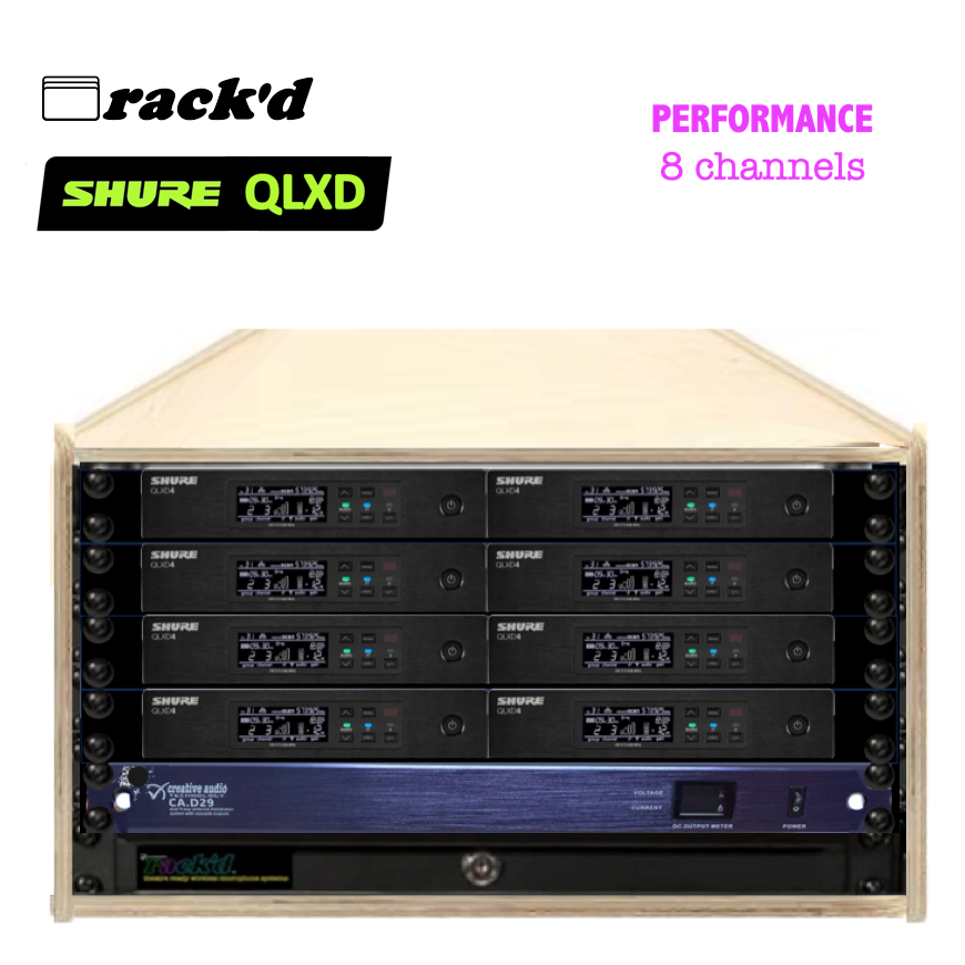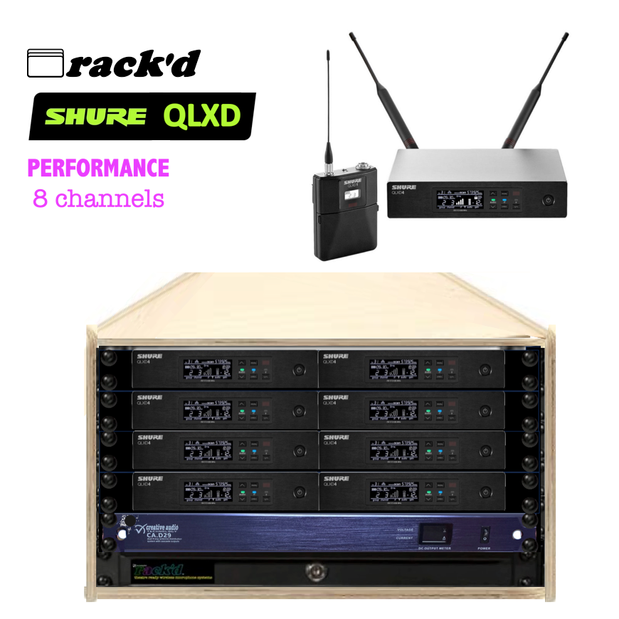 Our Rack'D PERFORMANC 8 channel QLXD system is built around 8xQLXD14 systems with receivers (1/2 width 1u rack) and transmitter bodypacks plus a high performance antenna distribution .system so that everything can be run from just 2 antennas and built into an premium plywood lacquered 6u rack.