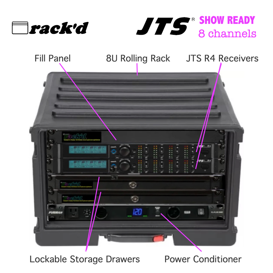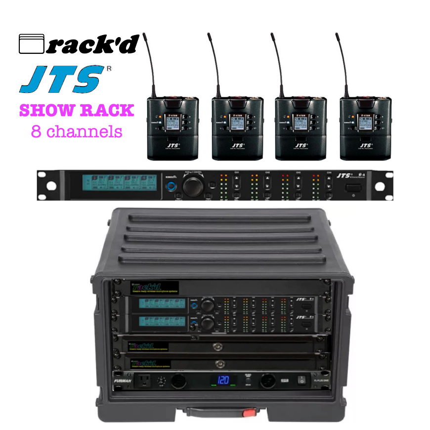 Our Rack'D SHOW READY 8 channel JTS R4 UHF system is built around 2x JTS R4 quad channel full width 1u rack receivers with built in antenna distribution so that everything can be run from just 2 antennas (included whips or included directional paddles) and 8x R-4TBM (metal) transmitter bodypacks - built into an SKB 8u Rolling Rack or a lacquered Plywood rack (ideal for sitting on the sound desk besides the mixer.