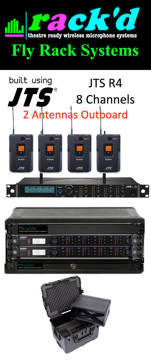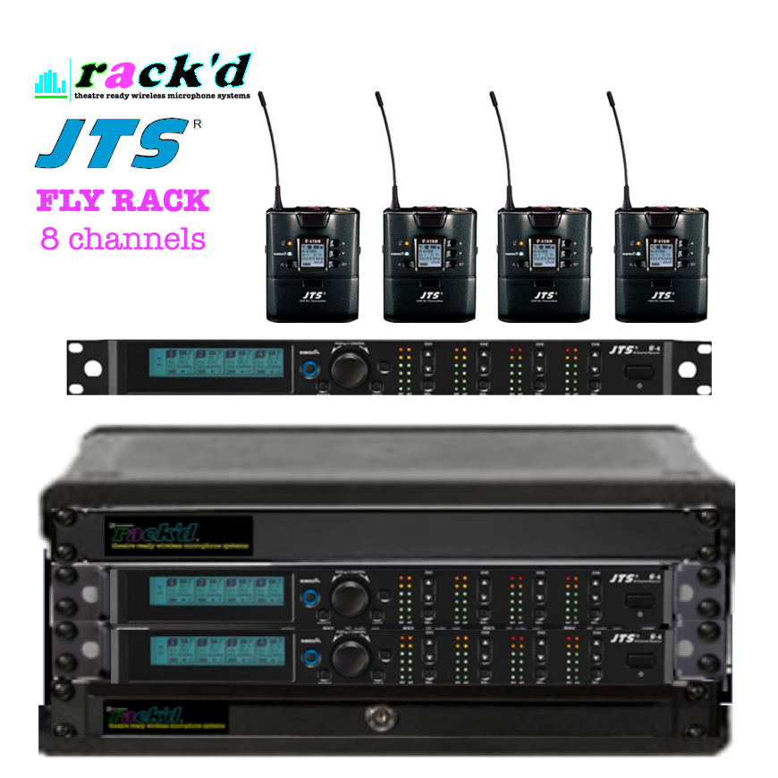 Our Rack'D FLY RACK12 channel JTS R4 UHF system is built around 2x JTS R4 quad channel full width 1u rack receivers with built in antenna distribution so that everything can be run from just 2 antennas and 8x JTS RU850 (plastic) or R-4TBM (metal) transmitter bodypacks - built into an SKB 3i-2317M146 Rack in a Rolling Case.