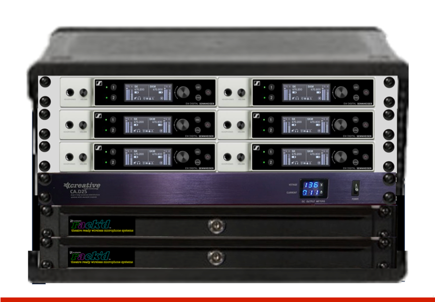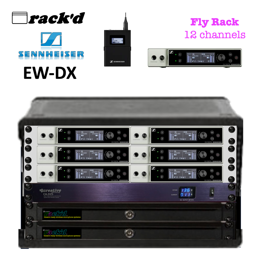 Our Rack'D FLY CASE 12 channel EW-DX digital audio over UHF system is built around 6x SENNHEISER EW-DX-EM dual channel half width rack receivers (1/2 width 1u rack) and 12x EW-DX-SK transmitter bodypacks plus a high performance antenna distribution .system so that everything can be run from just 2 antennas and built into an SKB 3i-2217M146 6u Rack in a Rolling Case.