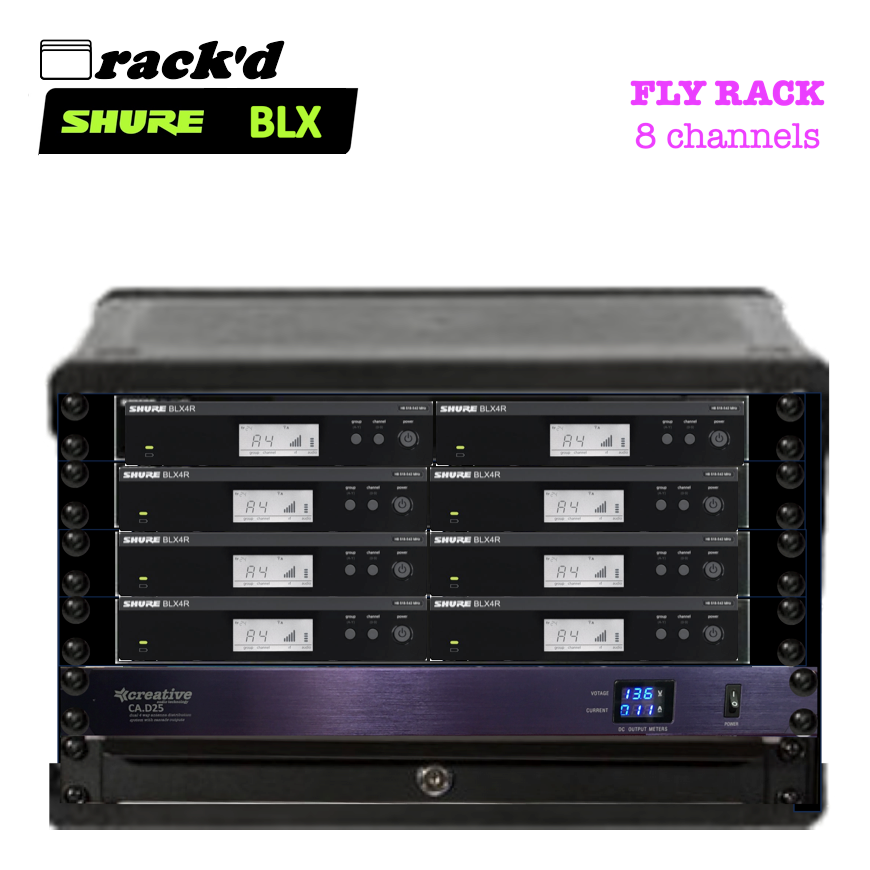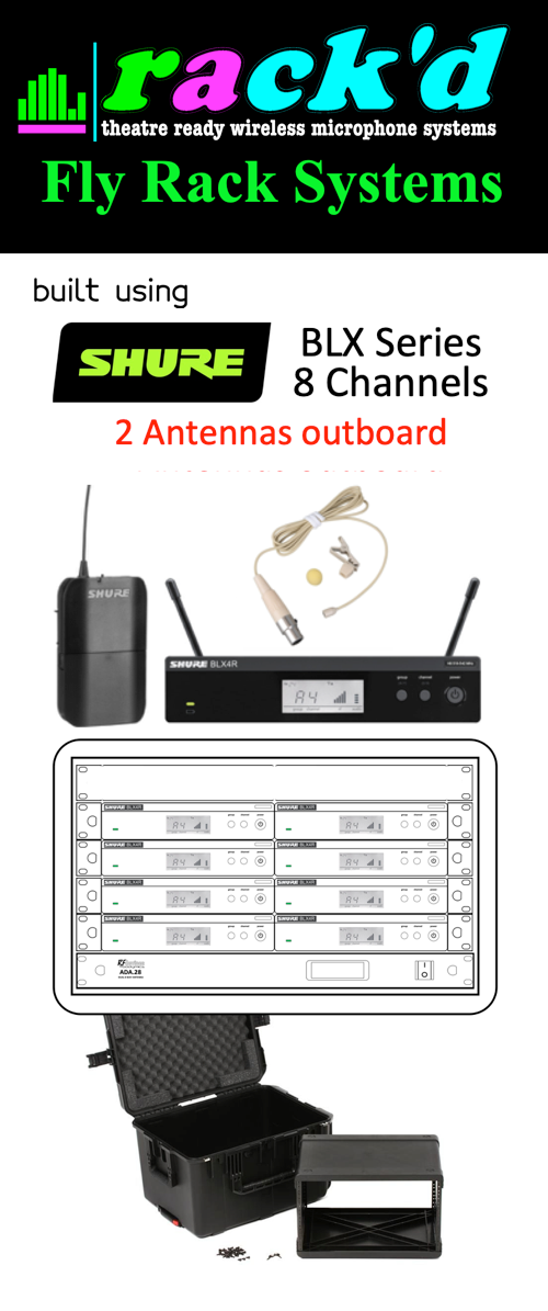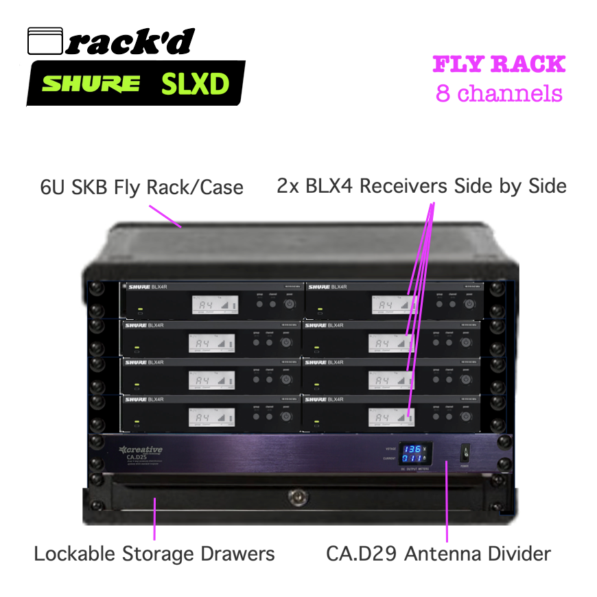Our Rack'D FLY CASE 8 channel BLX system is built around 8xBLX14R systems with receivers (1/2 width 1u rack) and transmitter bodypacks plus a high performance antenna distribution .system so that everything can be run from just 2 antennas and built into an SKB 3i-2317M146 6U Rack in a Rolling Case.