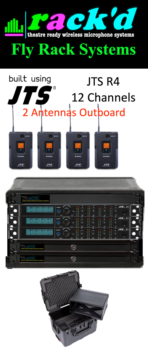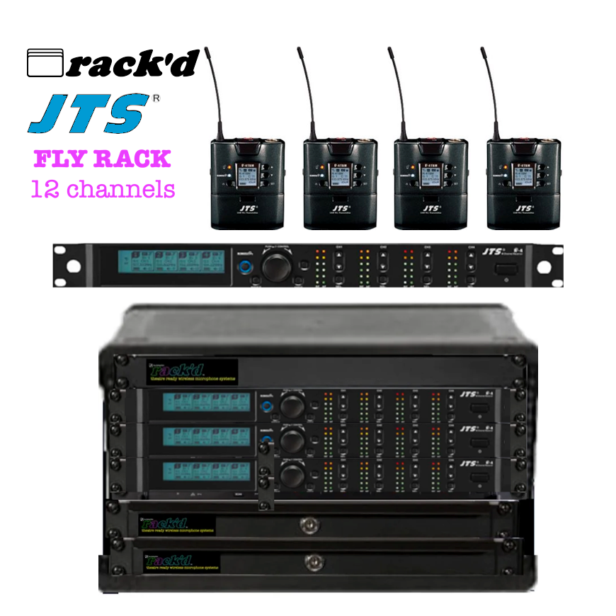Our Rack'D FLY RACK12 channel JTS R4 UHF system is built around 3x JTS R4 quad channel full width 1u rack receivers with built in antenna distribution so that everything can be run from just 2 antennas and 12x JTS RU850 (plastic) or R-4TBM (metal) transmitter bodypacks - built into an SKB 3i-2317M146 Rack in a Rolling Case.