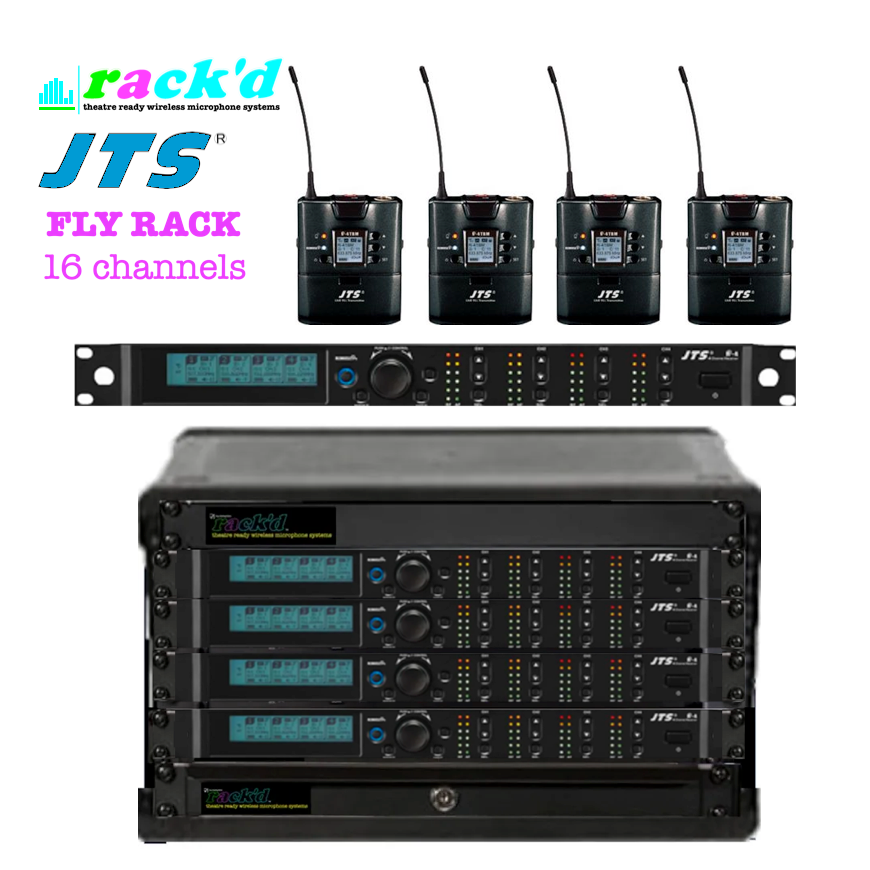 Our Rack'D FLY RACK16 channel JTS R4 UHF system is built around 4x JTS R4 quad channel full width 1u rack receivers with built in antenna distribution so that everything can be run from just 2 antennas and JTS RU850 (plastic) or R-4TBM (metal) transmitter bodypacks - built into an SKB 3i-2317M146 Rack in a Rolling Case.