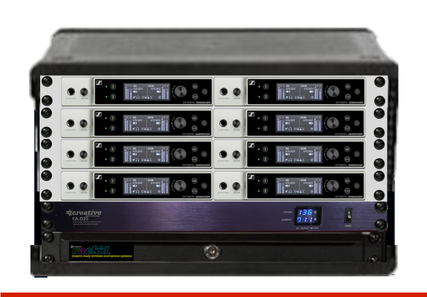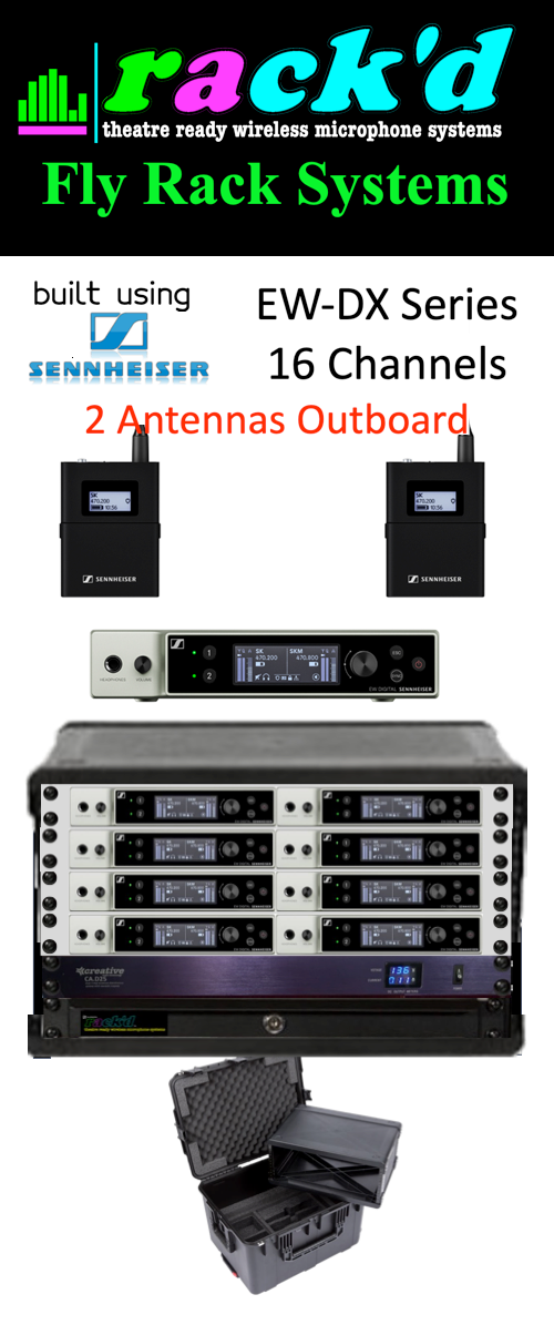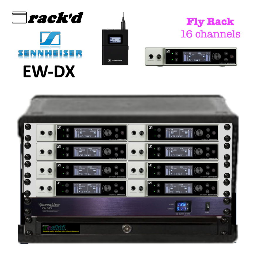 Our Rack'D FLY CASE 16 channel EW-DX digital audio over UHF system is built around 8x SENNHEISER EW-DX-EM dual channel half width rack receivers (1/2 width 1u rack) and EW-DX-SK transmitter bodypacks plus a high performance antenna distribution .system so that everything can be run from just 2 antennas and built into an SKB 3i-2217M146 Rack in a Rolling Case.