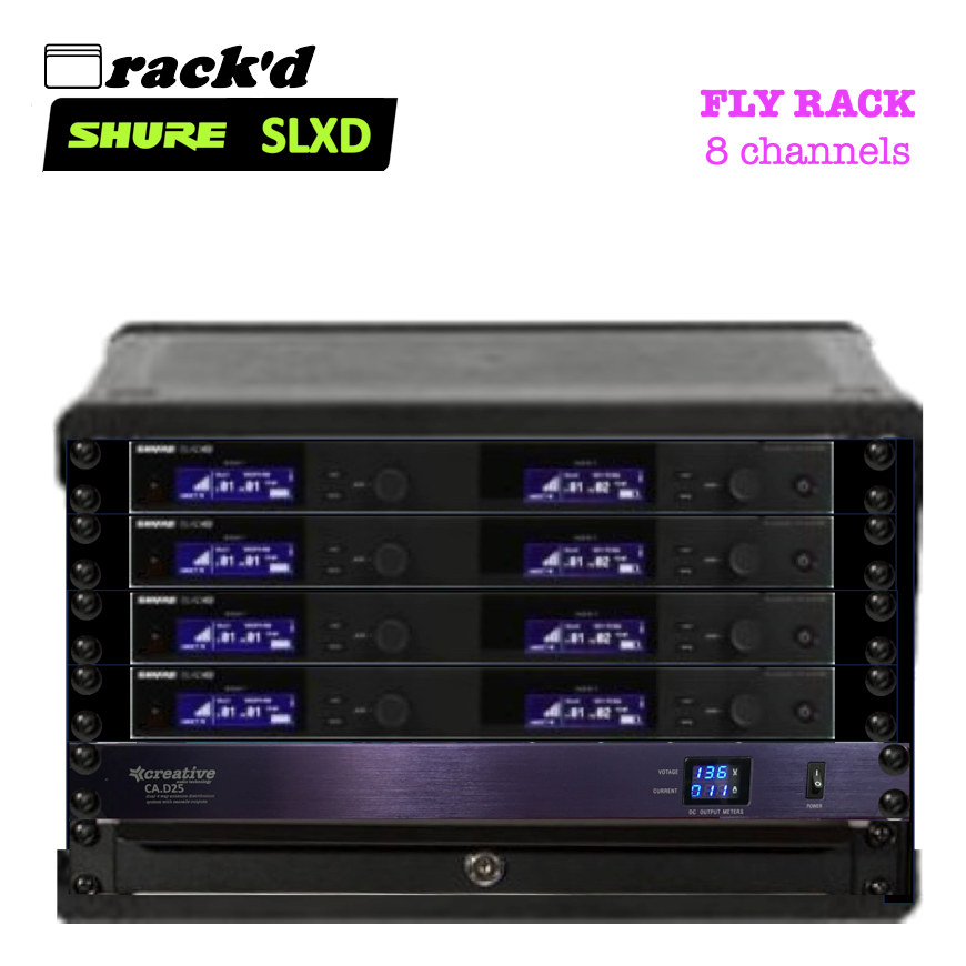 Our Rack'D FLY RACK 8 channel SLXD system is built around 8xSLXD14 systems (or 4x SLXD14D systems) with receivers (1u rack) and transmitter bodypacks plus a high performance antenna distribution system so that everything can be run from just 2 antennas and built into an SKB 3i-2317M146 Rack in a Rolling Case.