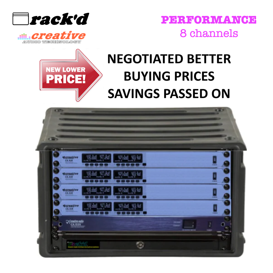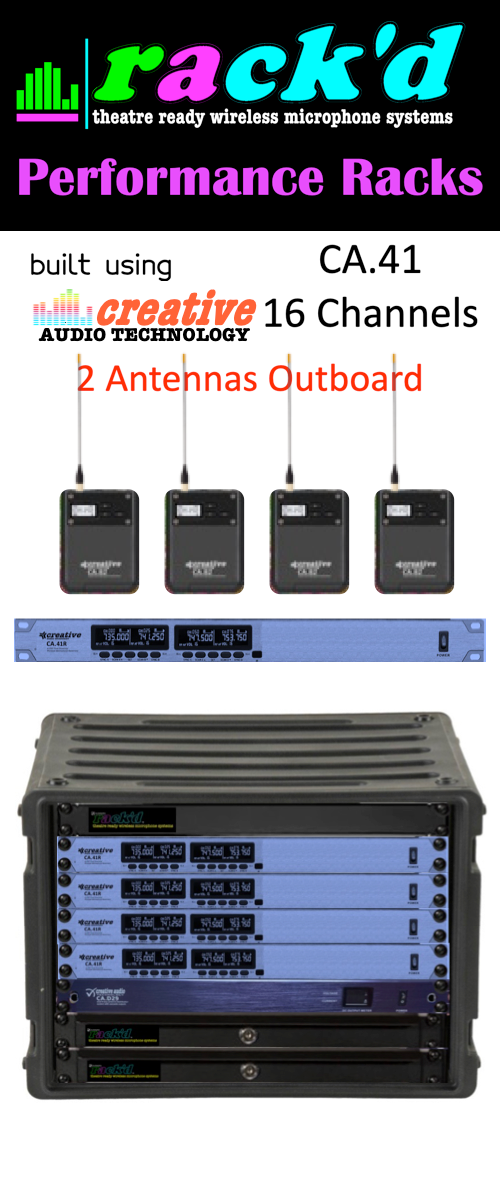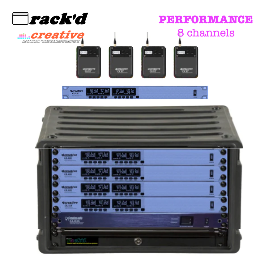 Our Rack'D PERFORMANCE 8 channel Creative Audio CA.41 UHF system is built around 4x Creative Audio CA.41 quad channel full width 1u rack receivers witha CA.D25 dual 5 way antenna distribution unit so that everything can be run from just 2 antennas and 8xCA.B2 (metal) transmitter bodypacks - built into an SKB 6 U lightweight rack with lids.