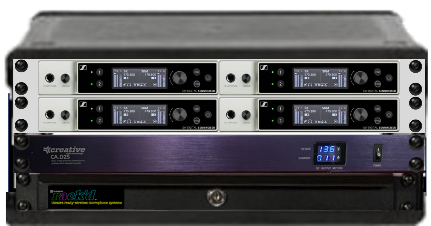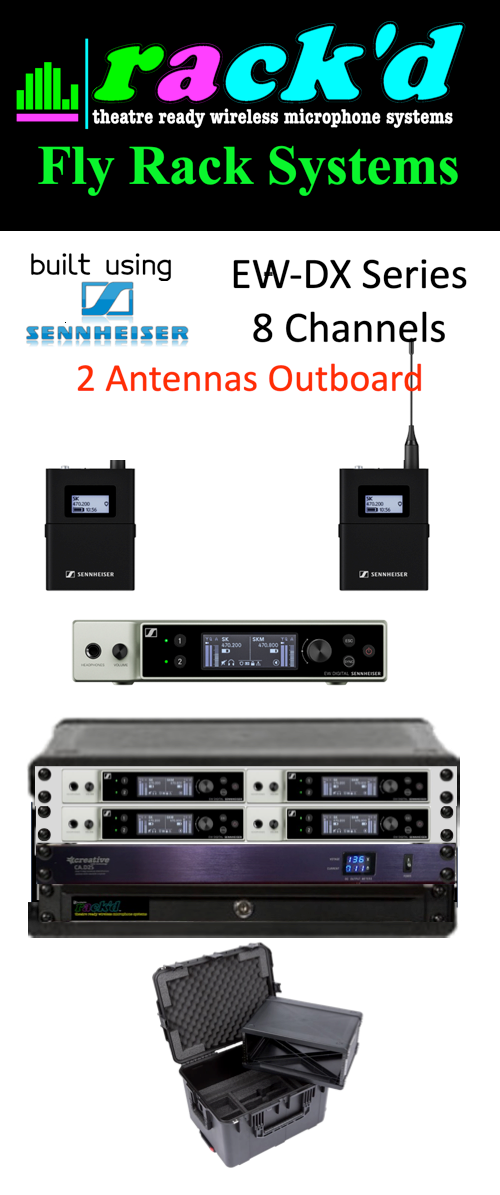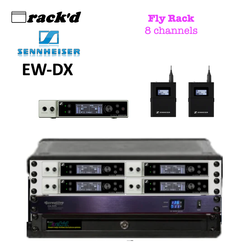 Our Rack'D FLY CASE 8 channel EW-DX digital audio over UHF system is built around 4x SENNHEISER EW-DX-EM dual channel half width rack receivers (1/2 width 1u rack) and 8x EW-DX-SK transmitter bodypacks plus a high performance antenna distribution .system so that everything can be run from just 2 antennas and built into an SKB 3i-2217M124 Rack in a Rolling Case.