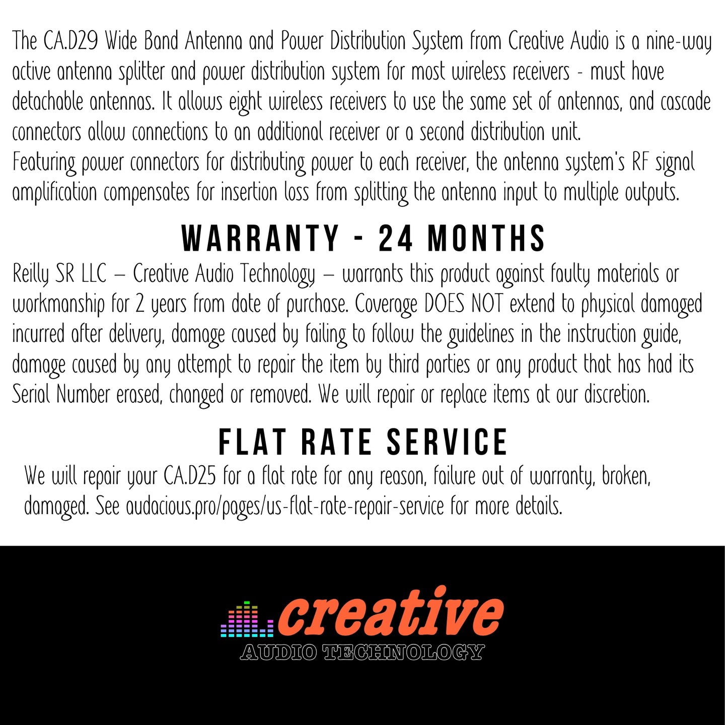 Reilly SR LLC – Creative Audio Technology – warrants this product against faulty materials or workmanship for 2 years from date of purchase. Coverage DOES NOT extend to physical damages incurred after delivery, damage caused by failing to follow the guidelines in the instruction guide, damage caused by any attempt to repair the item by third parties or any product that has had its Serial Number erased, changed or removed. We will repair or replace items at our discretion.