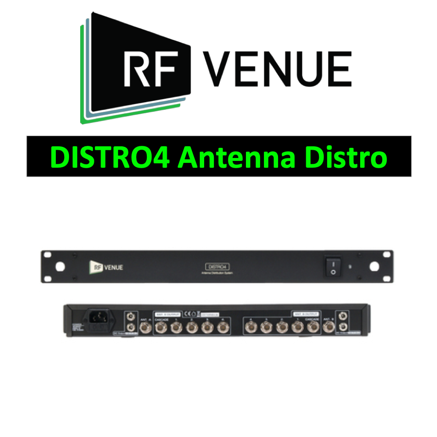 DISTRO4 features a 2000 mA internal power supply (no wall wart) and compares to antenna distributors twice its price. It includes all RF and DC power cables needed to connect a 4 channel wireless microphone system as well as cascade to one additional DISTRO4.