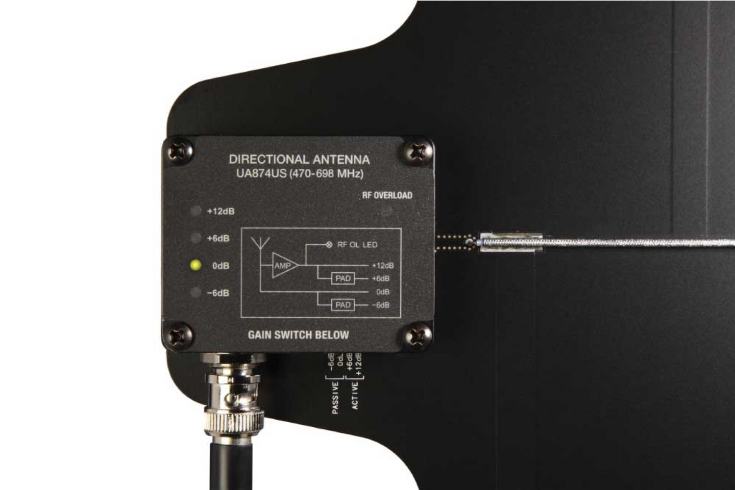 An integrated amplifier with 4 switchable (2 active/2 passive) gain settings compensates for varying degrees of coaxial cable signal loss.