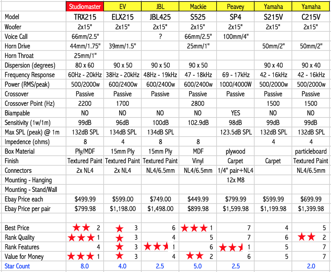 | Type | 10" 2-way active | 12" 2-way active | 15" 2-way active | 2x15" 2-way active | 15" 2-way monitor |