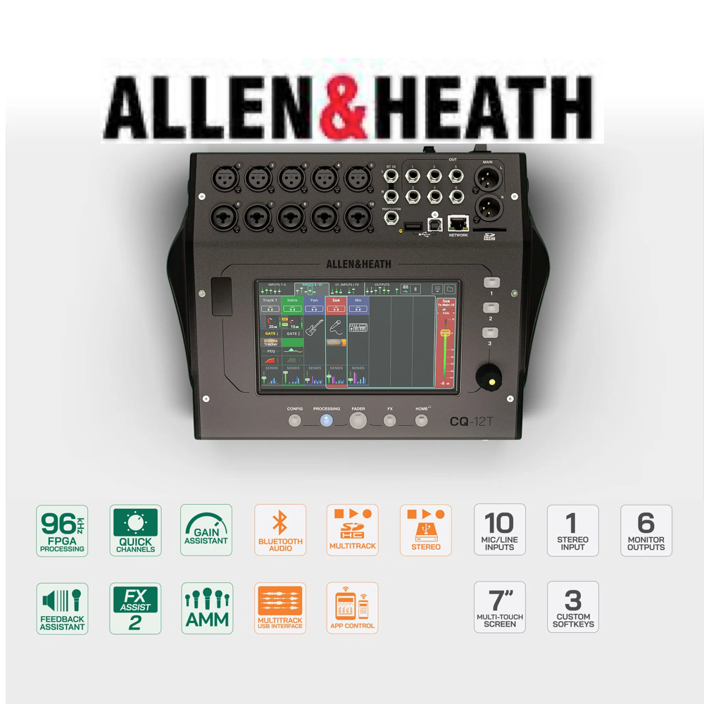 The CQ-12T digital mixer from Allen & Heath is built on a 96kHz platform capable of smart processing and rich in connectivity, network, Bluetooth, wireless options, SD and USB. The CQ is super portable and easy to use, but still a fully featured digital mixer, suitable for technical and nontechnical users. This fully featured mixer can fit in a backpack (or soft case) and delivers uncompromised audio quality, smart controls and smart processing tools so you don't need to be an expert engineer to sound amazing. A ‘Preamp Gain Assistant and Feedback Assistant allow for a faster setup, while instrument-based quick inputs get you to a great mix faster than ever. A unique combinations of tactile encoders, custom keys and a responsive touch screen offer multiple mixing interface options. The CQ-12T can be used as an interface, to record live shows or rehearsals, for virtual soundchecks or mix right out of the box.
